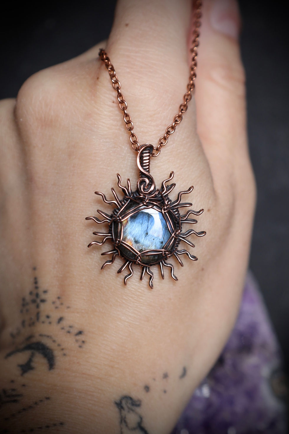 Labradorite and Quartz Crystal Boho Celestial Necklace in Copper